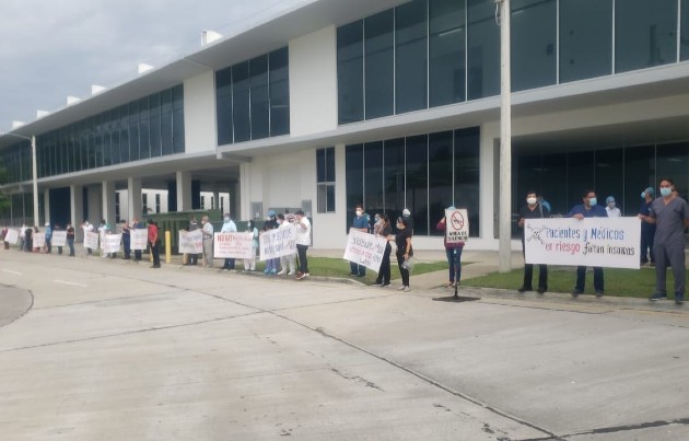 Médicos, enfermeras y personal administrativo de salud de la provincia de Chiriquí salieron a protestar por la falta de insumos para atender los pacientes que ingresan al nosocomio por Covid-19, lo cual está generando estrés y agotamiento entre el personal por el riesgo de contagio.