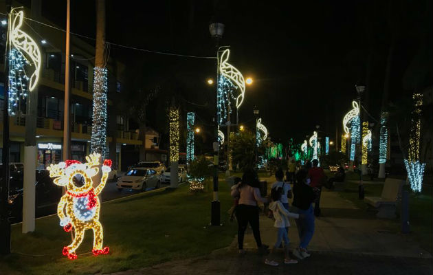 Los parques de la ciudad de Colón están adornados con figuras de nacimientos y regalos relacionados con la Navidad, mientras que en sus árboles cuelgan racimos de luces blancas.