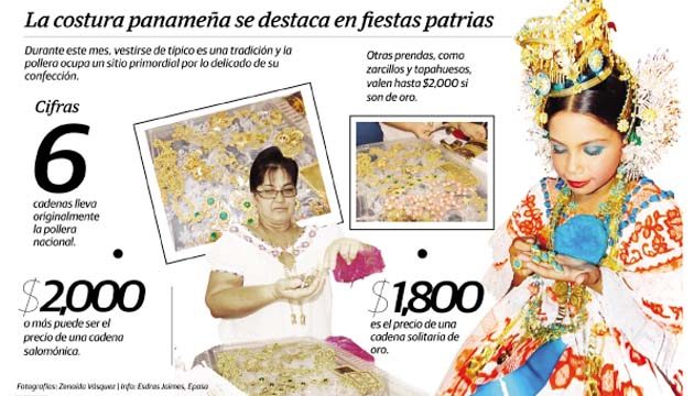 Este vestido típico de la mujer panameña es lucido sobre todo durante las fiestas patrias, tiene variados detalles, según explica un folclorista. Hay una cadena que es llamada la salomónica, por su parecido a las joyas que utilizaba el rey Salomón, las cuales eran fuertes y de gran valor.