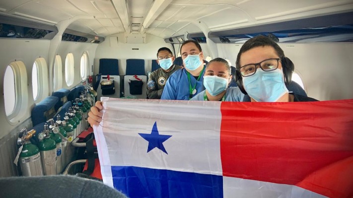 Unidades del Servicio Nacional Aeronaval (Senan) en un vuelo humanitario acompañado de un equipo de médicos y enfermeras de la provincia de Chiriquí, fueron en busca de tres transportistas de carga que se encuentran en la frontera de Costa Rica y Nicaragua quienes han dado positivo a COVID-19.