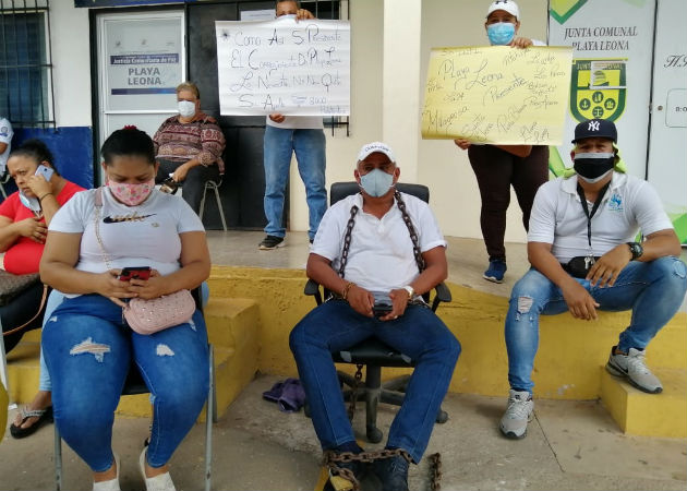 El representante de Playa Leona en el distrito de La Chorrera, Marcel Rivera, optó este lunes por encadenarse frente al edificio de la junta comunal para exigir la entrega de mayor ayuda gubernamental a población de su corregimiento.