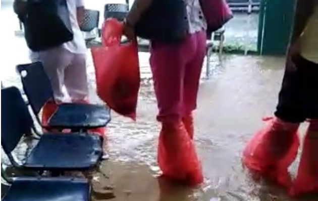 Personal médico y de enfermería del centro de salud de Puerto Caimito en La Chorrera, debieron utilizar este martes, bolsas de plástico en los pies, para abandonar esta instalación del Ministerio de Salud [Minsa]. Ello debido a que la parte externa del dispensario quedó inundada, tras la intensa lluvia registrada la tarde de este martes.