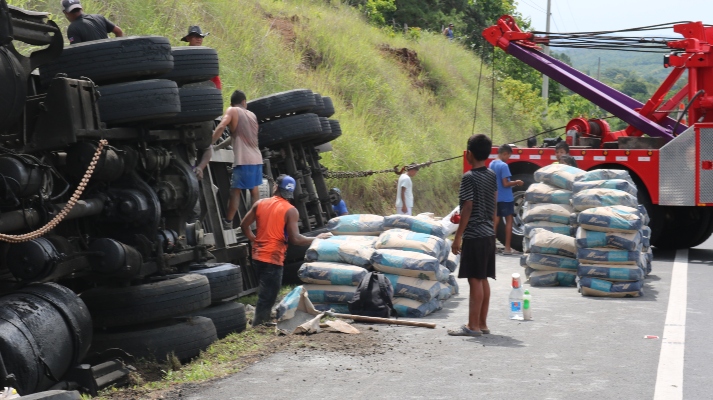 Un pesado camión articulado cargado con 800 bolsas de cemento se salió de la vía Panamericana en Limón Seco, corregimiento de Los Ruíces distrito de Las Palmas en Veraguas.