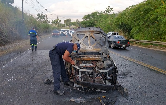El Cuerpo de Bomberos de Colón se trasladó al lugar para apagar el fuego que envolvió al taxi, que resultó en pérdida total.