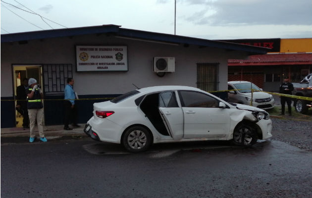 Los ocupantes de este vehículo, el cual presenta más de seis impactos de bala, buscaron refugio en la subdirección de la Policía Técnica Judicial de Vacamonte. Tres de los cinco hombres que viajaban en este auto resultaron heridos de bala.