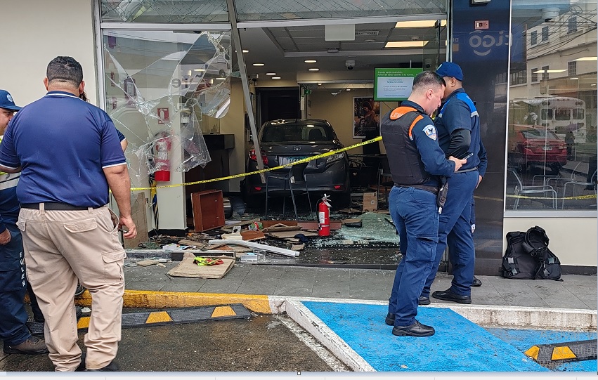 Cuantiosos daños materiales y una persona lesionada fue el resultado de un accidente que involucró a la conductora de un auto sedán que se estrelló contra la parte frontal de una entidad bancaría, cuando intentaba estacionarse.