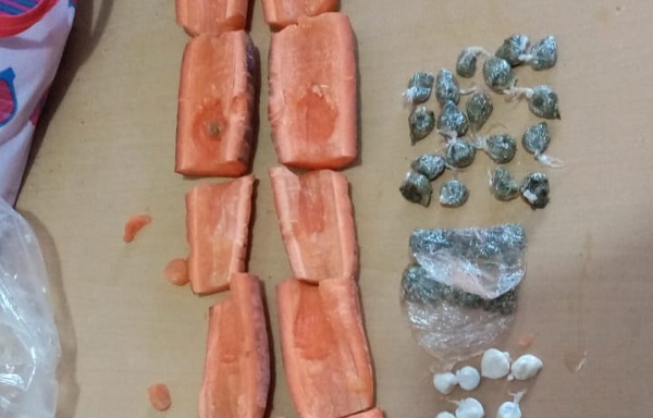 Mientras que en la revisión de encomiendas o valores, fue sorprendido un joven de 24 años tratando de ingresar dentro de zanahorias, 18 envoltorios de hierba seca y otros 2 de regular tamaño con la misma sustancias, y 10 envoltorios con polvo blanco.