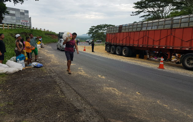 Un grupo de ciudadanos aprovechó el percance del articulado que transportaba el arroz para conseguir una buena cantidad del grano.