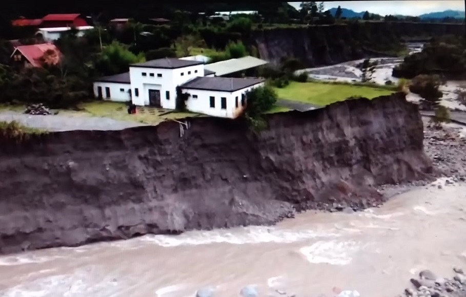 En las vistas aéreas se muestra como parte de la vía colapsó y una vivienda se mantiene en riesgo de derrumbe y caer al río Chiriquí Viejo, el cual ha tomado otro cauce.