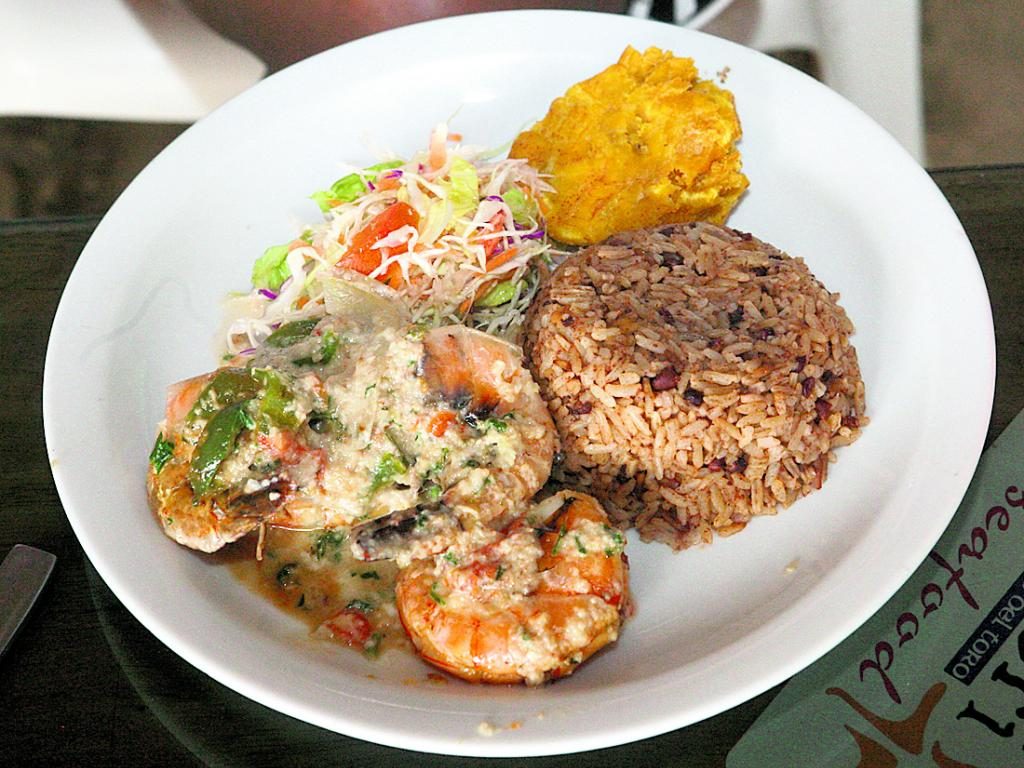 Aquí disfrutamos del afamado arroz con coco y frijol junto a langostinos en una salsa inolvidable.