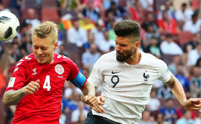 Simon Kjaer (izq.) de Dinamarca y Olivier Giroud (der) de Francia. Foto:AP