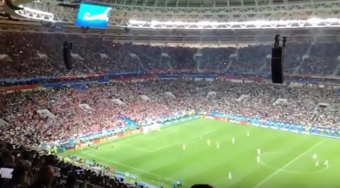 En unas imágenes, grabadas por un aficionado y difundidas a través de la red social twitter, se ve desde arriba de la grada del estadio Luzhniki cómo tres ingleses sacaron de centro a toda velocidad y acabaron abortando el ataque justo delante del portero croata Danijel Subasic.