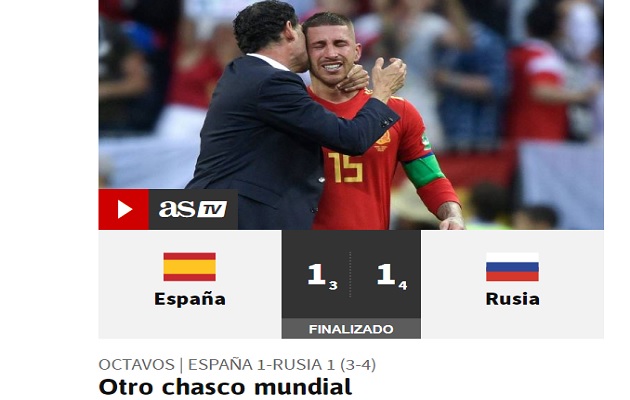 "Otro Chasco Mundial", titula el diario madrileño AS, y añade: A la Seleccion le sobraron pases y le faltó arrojo para eliminar a un rival muy inferior. Akinfeev fue el héroe, con grandes paradas y dos penas máximas detenidas en la tanda".