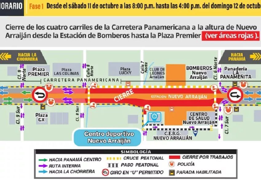 Fase 1: Desde las 8:00 p.m. del sábado 11 de octubre hasta las 4:00 a.m. del domingo 12 de octubre. Durante este período, se cerrarán los cuatro carriles de la vía Panamericana, desde el sector de Nuevo Arraiján hasta el cuartel de bomberos en Plaza Premier.