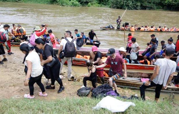 Migrantes viajan en canoas en el sector de Lajas Blancas, en Darién. Foto: EFE