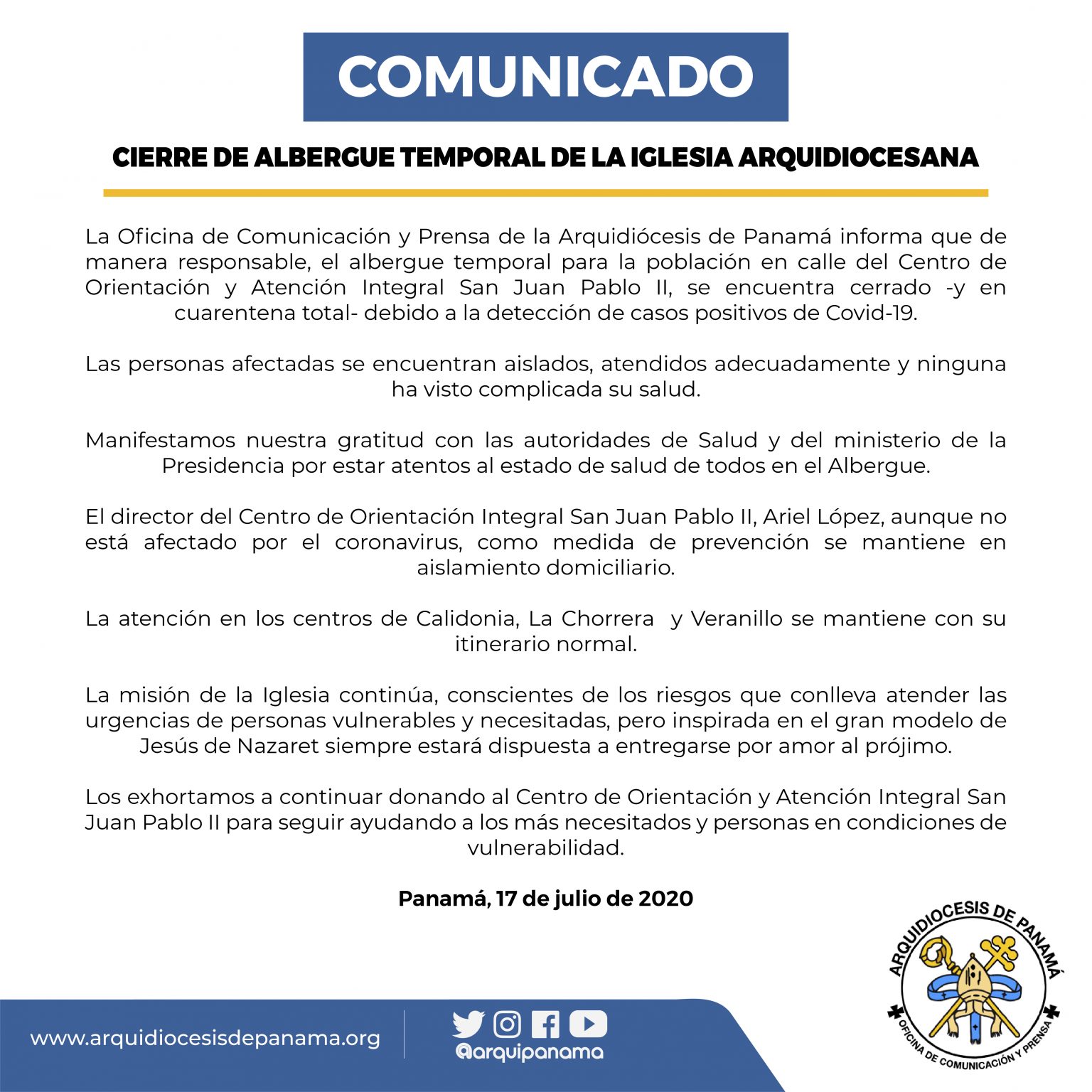 La Oficina de Comunicación y Prensa de la Arquidiócesis de Panamá informó que las personas afectadas se encuentran aisladas, atendidas adecuadamente y que hasta el momento ninguna se ha visto complicada su salud.
