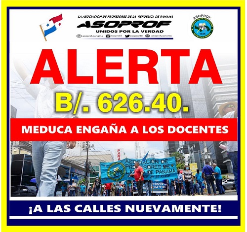 Fernando Ábrego, secretario general de la Asociación de Profesores (Asoprof) recordó que el pasado 19 de mayo, en reunión con las autoridades se llegó al acuerdo del pago de los 626.40 que se les debe del tercero y último ajuste salarial, sin embargo, al parecer no está asegurado.