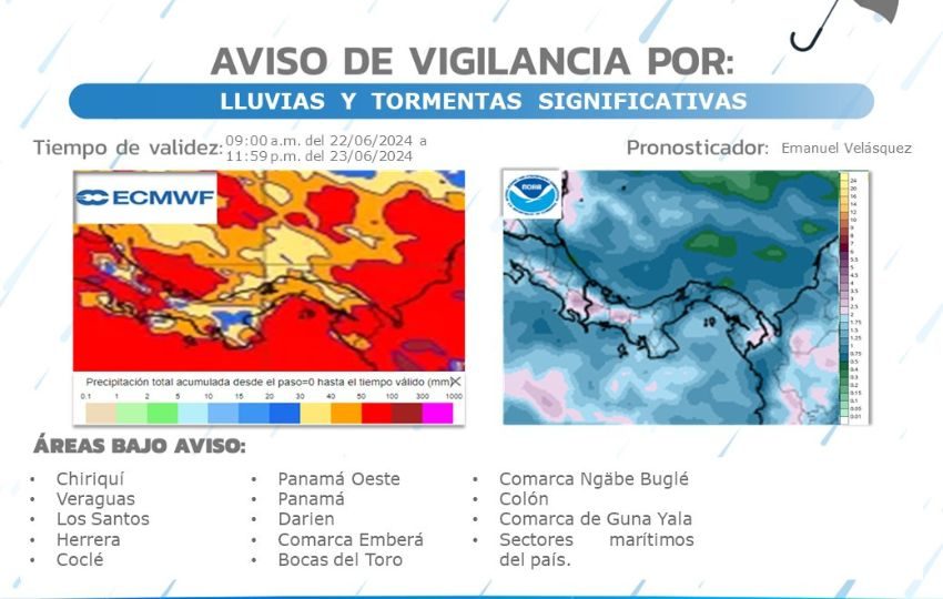 Las áreas que están bajo aviso son Chiriquí, Veraguas, Los Santos, Herrera, Coclé, Panamá Oeste, Panamá, Darién, Bocas del Toro, Colón, comarcas Emberá, Ngäbe Buglé, Guna Yala y sectores marítimos.