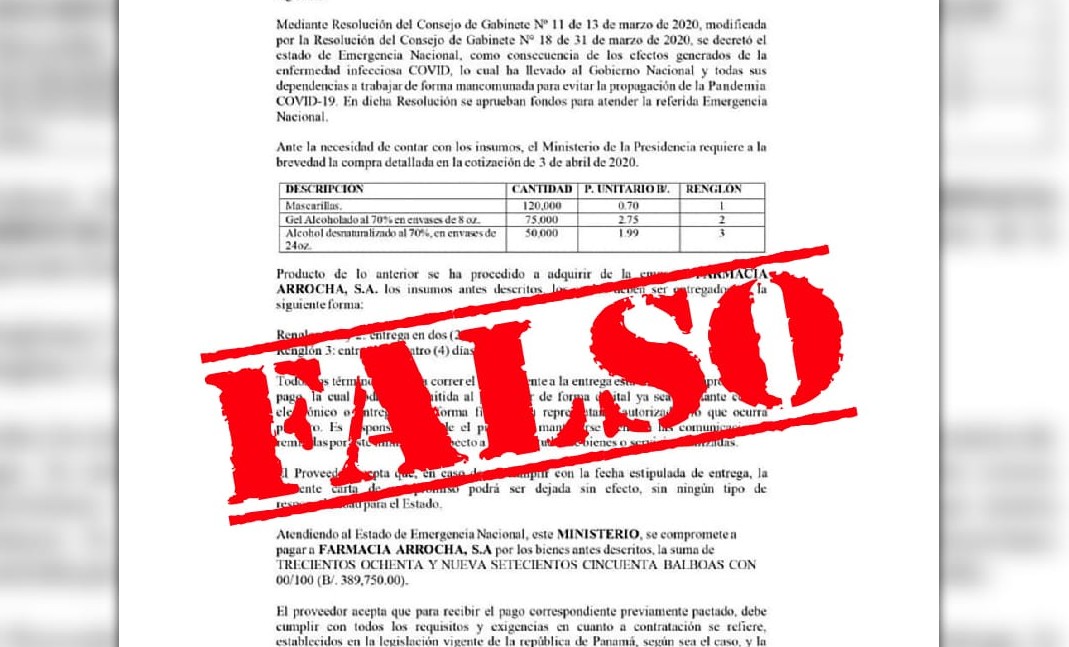 En las redes sociales circula un documento sobre la venta de insumos de higiene y sanitización por parte de Farmacias Arrocha al Ministerio de la Presidencia.