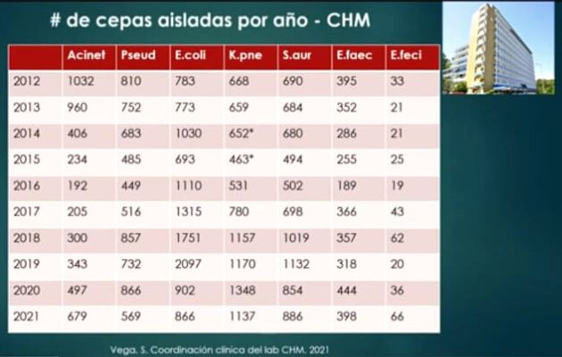 En Panamá, cepa aisladas desde el 2012 al 2021 en el Complejo Hospitalario Harmodio Arias Madrid (CHAM) de la Caja de Seguro Social (CSS) destaca la presencia de Acinetobacter baumannii, Pseudomonas aeruginosa, Escherichia Coli, Klebsiella pneumoniae, Staphylococcus aureus, Enterococcus faecium y E feci.