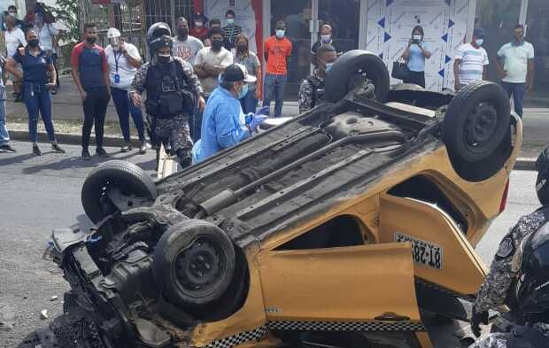 El hecho se suscitó entre motorizados y un vehículo taxi que quedó volcado sobre la vía.