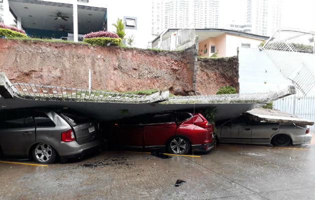Cuatro vehículos fueron seriamente afectados este martes, tras undeslizamiento de tierra y colapso de un muro de concreto en el estacionamiento de Casa Gala, en El Dorado, en la avenida Ricardo J. Alfaro (Tumba Muerto).