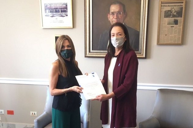 María del Carmen Sacasa (dcha.) presenta sus credenciales ante la viceministra a.i de Asuntos Multilaterales y Cooperación, Ana Luisa Castro Novey, como Representante Residente del PNUD. Foto: Cortesía PNUD