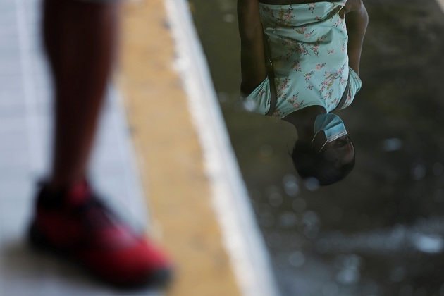 Una mujer hace fila en Panamá para realizarse una prueba de hisopado para detectar la COVID-19. Foto EFE