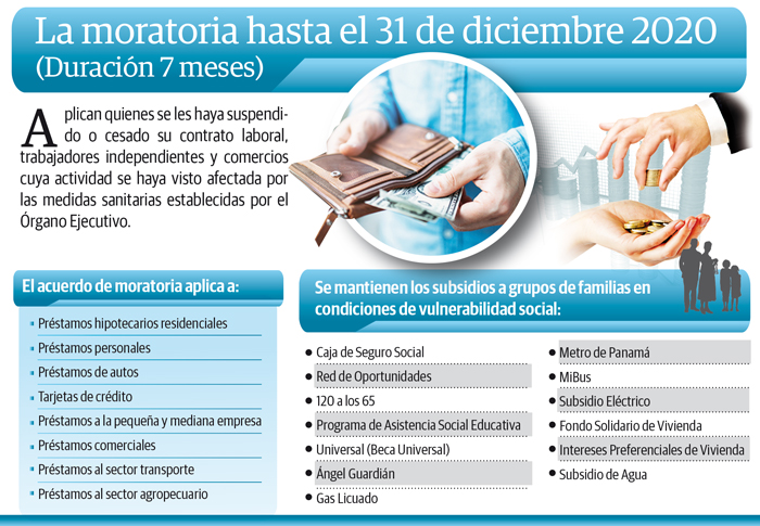 Aimeé Sentmat, presidenta de la Asociación Bancaria de Panamá, indicó que esta medida no actúa de forma automática, porque lo que busca es ayudar a los clientes afectados por la pandemia. Por ende, sugirió a quienes tienen préstamos, que llamen a los bancos para encontrar mecanismos de soluciones sobre sus pagos, e incluso hasta de más largo plazo.