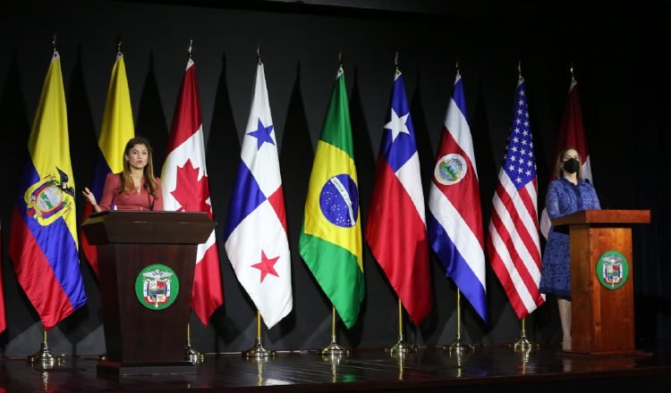 La canciller y la directora de Migración dan detalles de lo discutido en la reunión, con las banderas de los países participantes, al fondo. Foto: Cortesía Cancillería