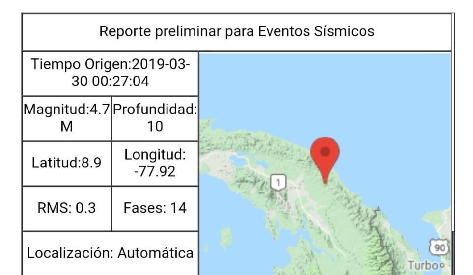 #UltimoSismo 4.7 registrado sin afectación en el área limítrofe entre Guna Yala y Darién, información suministrada por @igcpanamaup pic.twitter.com/ZtPiqmNVYl— SINAPROC PANAMA (@Sinaproc_Panama) 30 de marzo de 2019