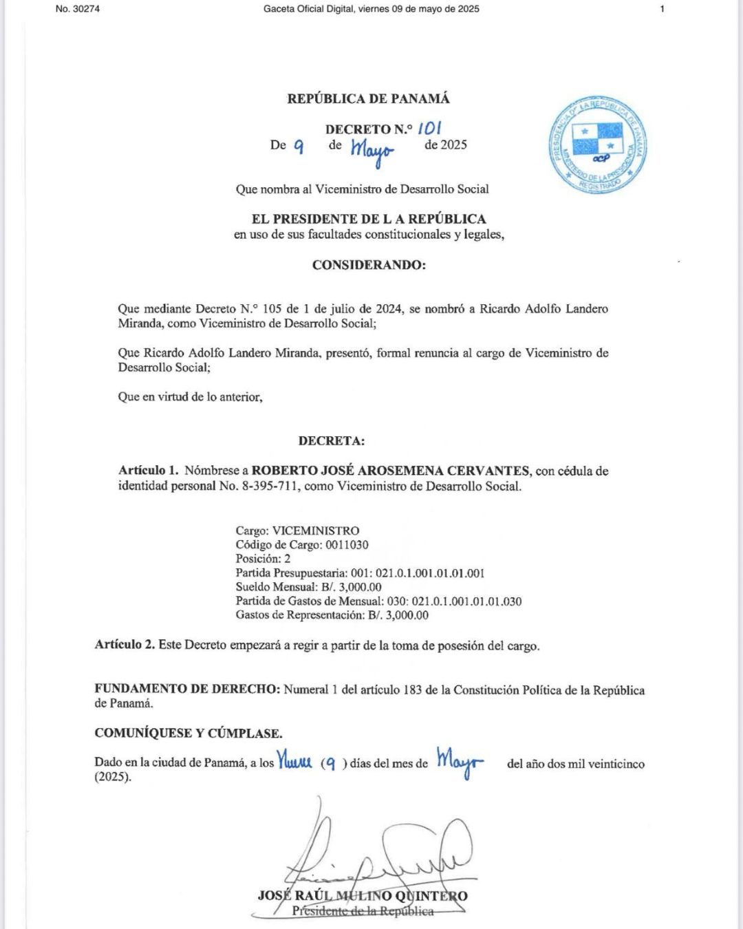 La renuncia y el nuevo nombramiento fueron publicados en la Gaceta Oficial mediante el Decreto 101 del 9 de mayo de 2025.