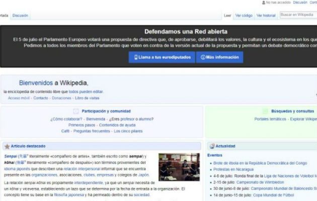 Tras sentirse amenazada con la nueva normativa europea sobre derechos de autor, la fundación Wikimedia (organización que promueve la enciclopedia digital Wikipedia) ha restringido el acceso a su contenido a manera de protesta, para pedir la eliminación de los artículos 11 y 13 de la directiva, la cual se votará mañana, 5 de julio, a las doce del mediodía en el Parlamento Europeo.