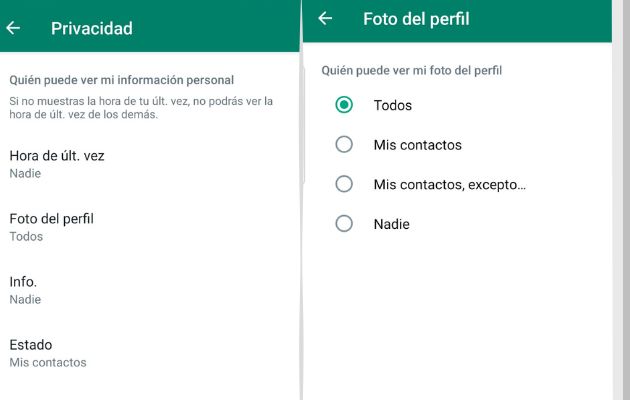 2. Ya puedes seleccionar cualquier quién puede ver Hora de última vez, Foto de perfil, Info, Estados. En el caso de configurar quién verá la foto de perfil, se abrirán una serie de opciones Todos, Mis contactos, Mis contactos, excepto..., nadie. Al seleccionar Mis contactos, excepto, se abrirá la agenda completa de contactos de WhatsApp y podrás hacer la exclusión.