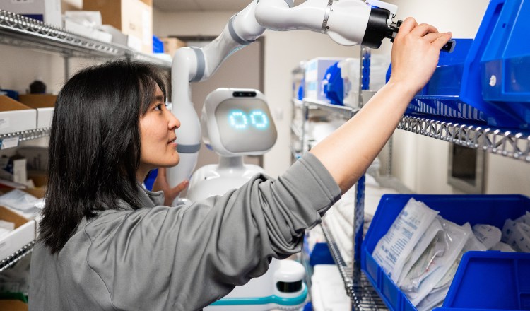 Moxi, de Diligent Robotics (DR), tiene una cara expresiva para comunicarse, una base móvil para desplazarse y un brazo mecánico para asir objetos. Permite que las enfermeras pasen más tiempo en la atención directa a los pacientes.