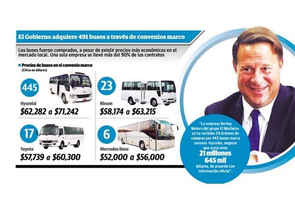 Práctica que fue criticada: El presidente Varela ha impulsado la compra masiva de buses de 30 pasajeros sin licitación, la cual ha permitido ayudar el negocio de un donante de su campaña. Durante la política, el actual gobernante criticó esta forma de adquisición de bienes.