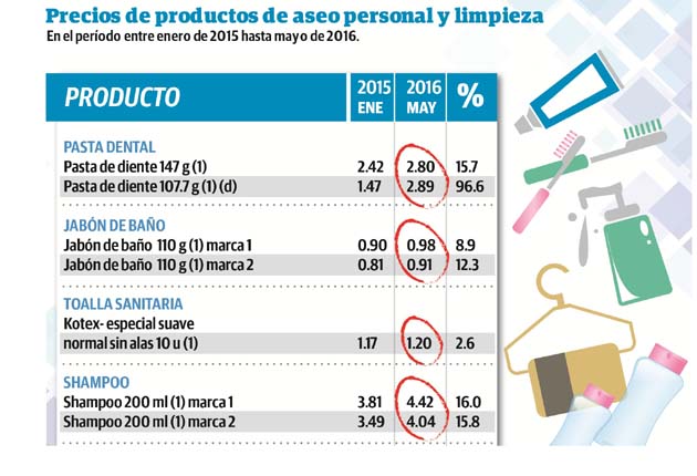 Los productos de cuidado personal aumentaron de precio en un 3.1% en mayo pasado en relación a igual periodo del 2015, según registra la Contraloría General de la República en su informe del Índice de Precios al Consumidor.
