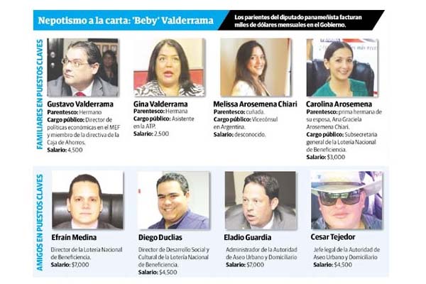 El diputado Adolfo "Beby" Valderrama no solo ha sido vinculado a empresas que habrían logrado grandes negocios con el Gobierno, sino que también ha conseguido meter en la planilla pública a sus hermanos, cuñadas, primas y amigos. Todos con buen salario y en puestos clave de la administración de Juan Carlos Varela.