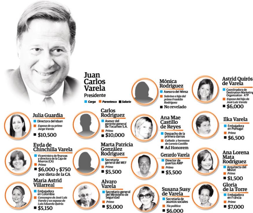 La esposa de su primo Jorge Varela, Julia Guardia, como directora del Idaan, con un salario de 10,500 dólares; su prima Eyda Varela de Chinchilla con doble cargo, viceministra de Finanzas, con 6,000 dólares de salario, y directiva de la Caja de Ahorros, con 750 dólares por dieta o reunión; su primo Carlos Rodríguez como asesor del Aeropuerto de Tocumen con 10,000 dólares en salario, entre otros.