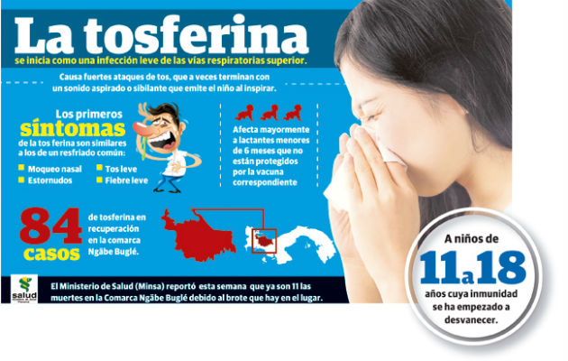 La tosferina podría convertirse en un problema de gran magnitud para los ministerios de Salud y Educación, a escasos 17 días para que se inicie el año escolar 2019, debido a que se han presentado nuevos casos en puntos distintos a la comarca Ngäbe-Buglé, donde se registró un brote.