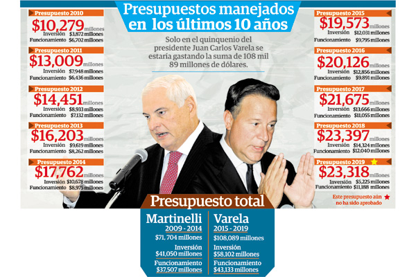 De acuerdo con cifras obtenidas, la administración del presidente Ricardo Martinelli, durante el periodo 2009 - 2014, se gastó en presupuesto la suma de 71 mil 704 millones de dólares, mientras que en la del presidente Varela se estarían gastando 108 mil 89 millones de dólares. Esto de acuerdo con el último presupuesto aprobado por el Consejo de Gabinete.