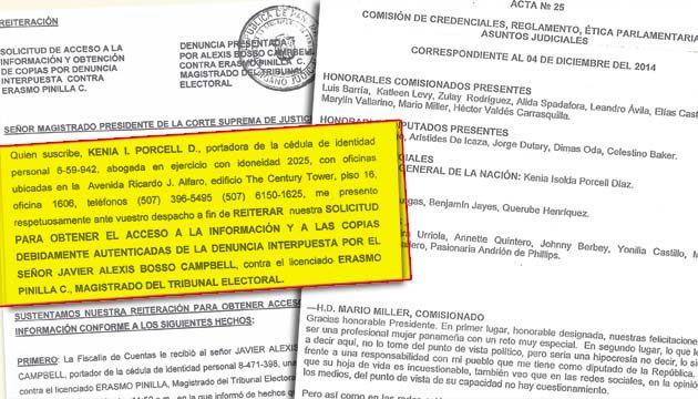 El 4 de diciembre de 2014, Kenia Porcell dijo ante la Comisión de Credenciales de la Asamblea Nacional que no tenía ningún vínculo con el magistrado presidente del Tribunal Electoral (TE), Erasmo Pinilla.