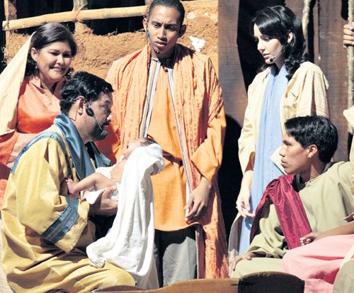 Al final del espectáculo, donde se enfatizó en el verdadero significado de la Navidad y la necesidad de despertar de la abulia, de sacar del equipaje toda carga negativa que impida avanzar presurosos por el sendero que conduce a la salvación, José elevó los brazos al cielo sosteniendo en sus manos al Niño Dios y el coro cantó El Mesías.