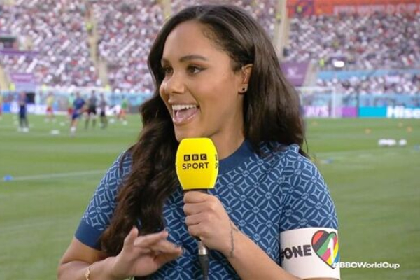 ¡Sin miedo al éxito! Alex Scott, experta invitada de la BBC y exfutbolista inglesa, usó un brazalete “One Love” en solidaridad a la comunidad LGBTQ+ durante la cobertura del primer partido de Inglaterra en el Mundial de Qatar 2022.
