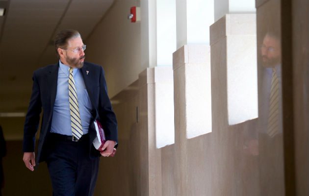 El juez Steven T. O'Neill silba mientras camina por el juzgado después de enterarse de un veredicto para el nuevo juicio por asalto sexual de Bill Cosby