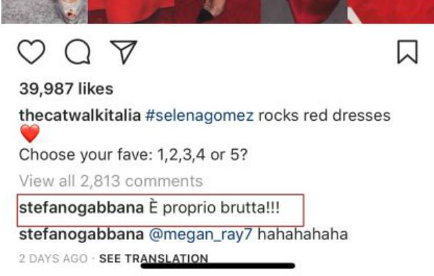 Gabbana de 55 años comentó en la publicación: “È proprio brutta!!!” que se traduce en español como “ Es tan fea”, un comentario que inmediatamente provocó gran molestia y críticas de parte de los seguidores de Selena.