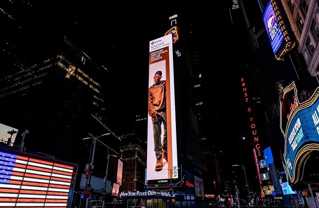 Valla con la imagen de Humberto Ceballos Boza en el Time Square. Foto: @bozamusic