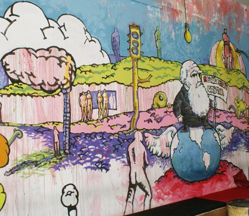 En tanto, en el mural dedicado a Darwin y su re evolución, personaje que se alumbra por un foco, este proviene de los recuerdos de la niñez del pintor, quien vivía en una vivienda con poca luz en Calidonia en la que sobre- salía un foco.