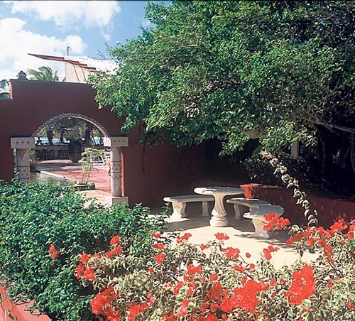 Influencia marroquí.El elemento principal es el agua, una fuente proporciona el ambiente ideal. La mayoría de las plantas van en macetas y plantas de hojas grandes y trepadoras.