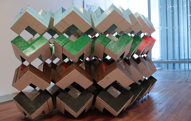 A la vez, siempre me llamaba la atención el Canal de Panamá, por donde navegan barcos con banderas de todos los países. De ahí que la escultura “Cuatro estaciones” de madera policromada que busca representar un barco cargado de contenedores de colores.